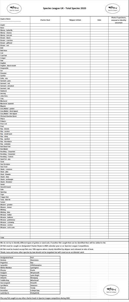 To compete all you have to do is come to at least one of the Species League matches – there is no extra charge and all you have to do is record the species you catch and ask the skipper to initial your own form to confirm your catch. Below is a personal form that you can print off or save