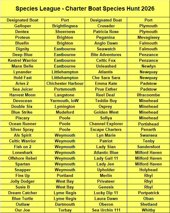 Catch as many species as you can from one of the Charter Boats on the list below at any time from 1st December 2025 to end November 2026 and any species you catch on board any Charter Boat in a Species League match in 2026 and in the WIBAC and Weymouth pairs competitions and any WFSA (England) competition.